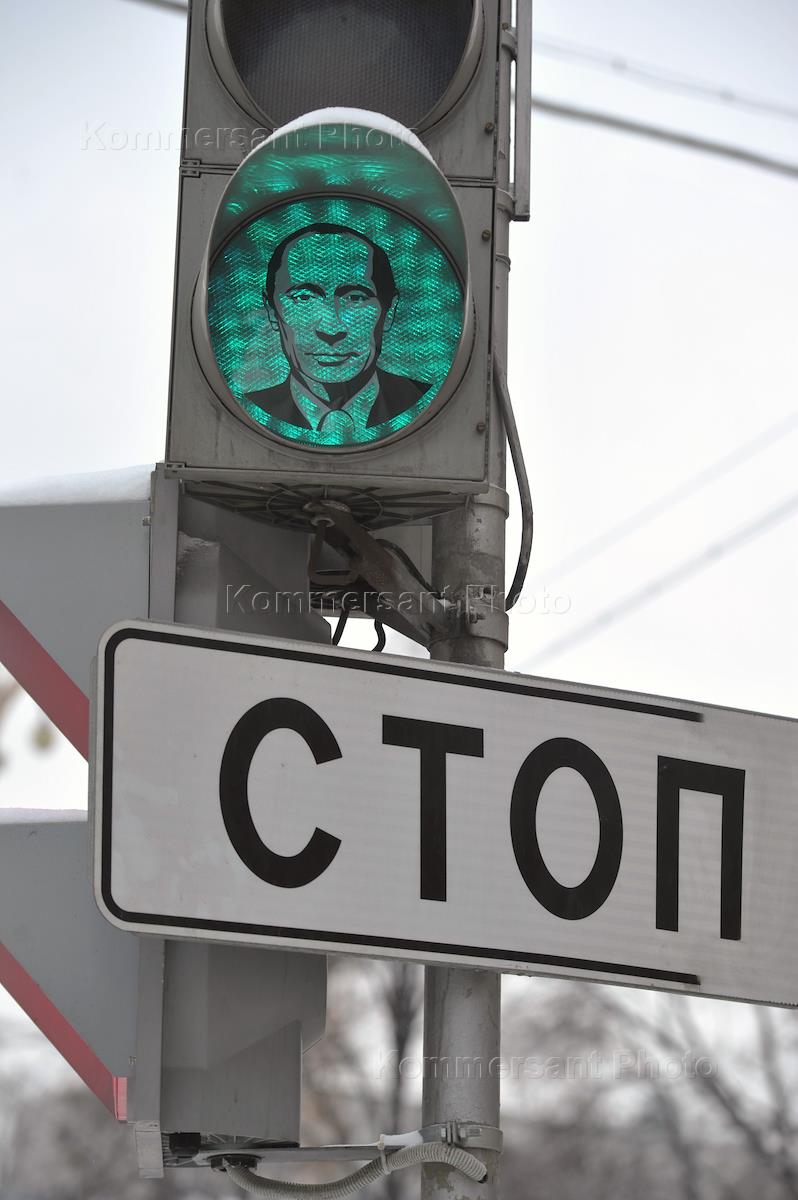 Светофор на пересечении ул. М. Дмитровка и Страстной бульвар. Зеленый свет светофора с портретом…