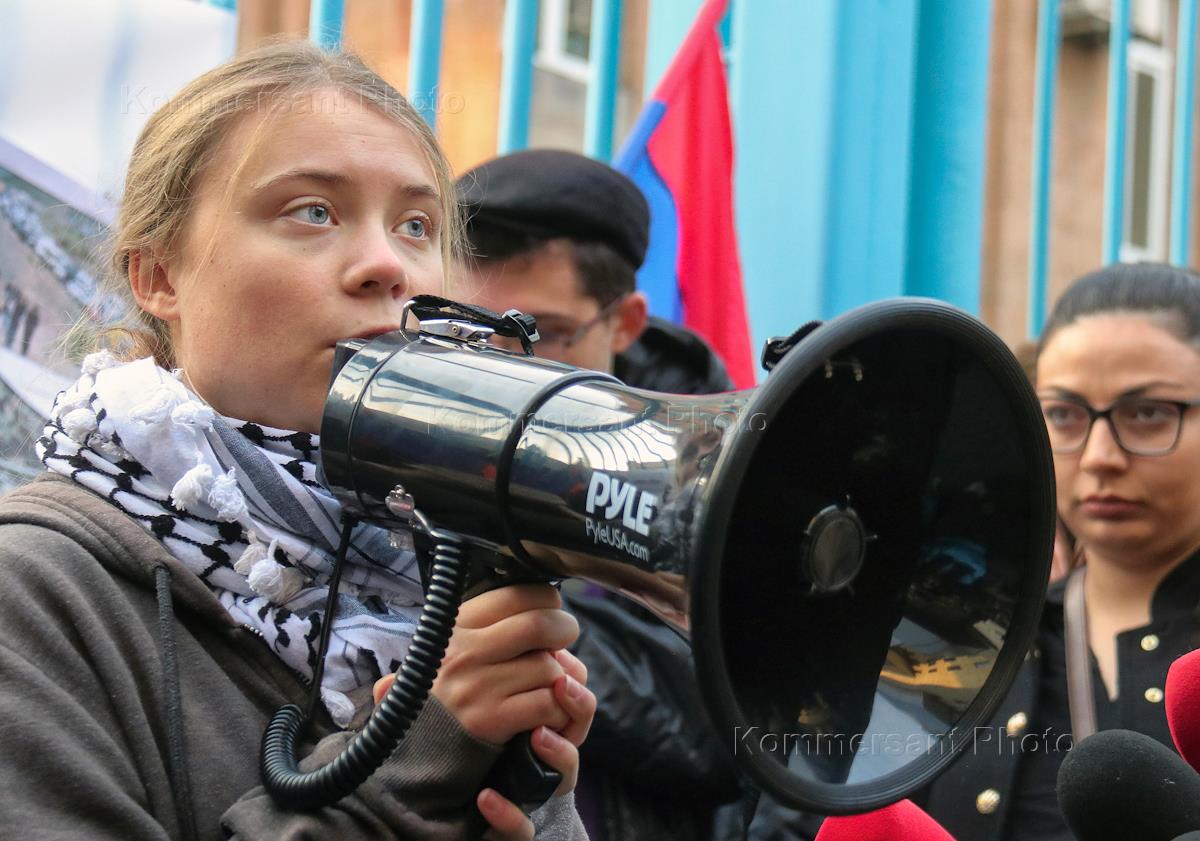 Экологическая активистка Грета Тунберг во время акции у здания ООН в Ереване.
