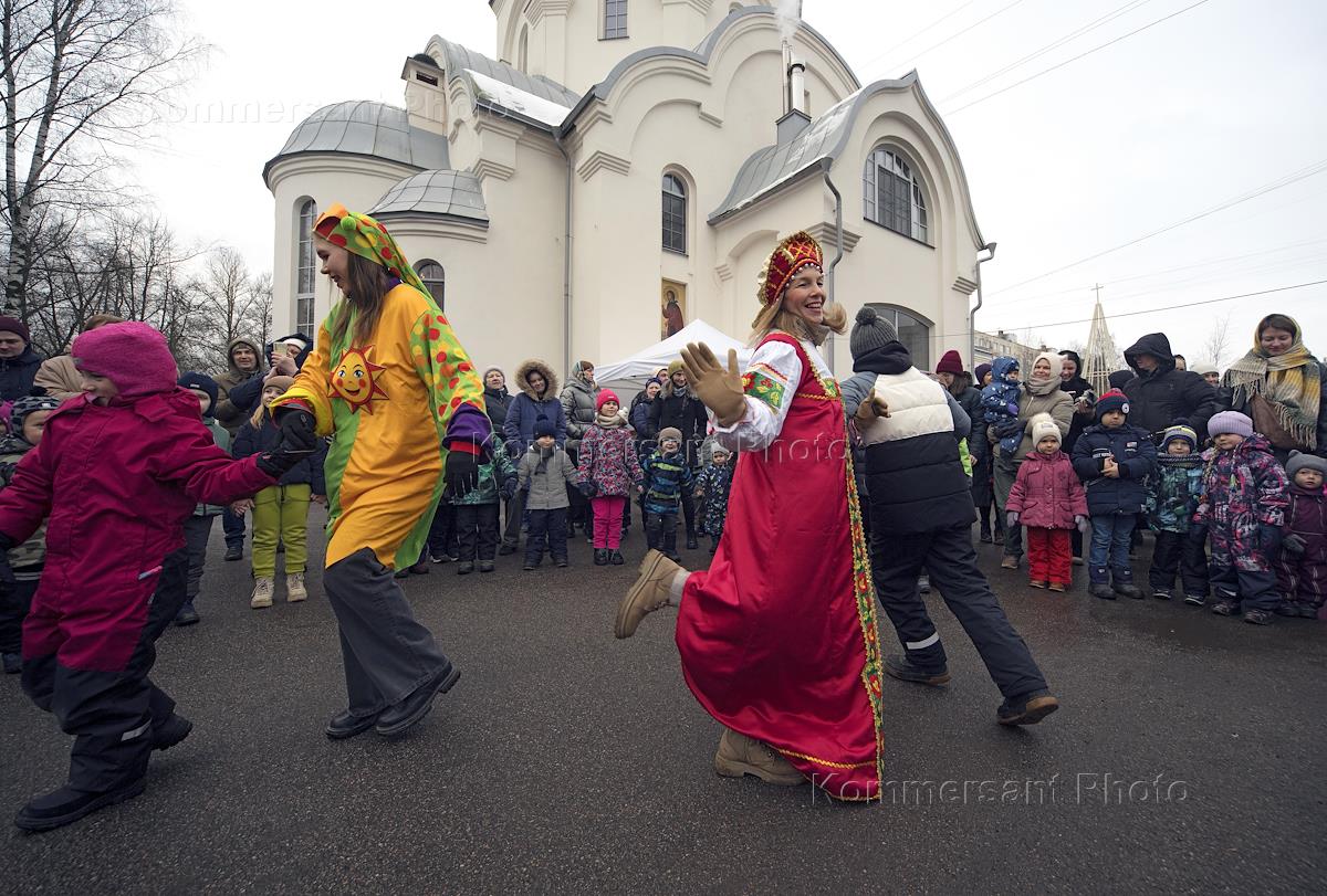 Празднование Масленицы на территории храма Тихвинской иконы Божией Матери в Санкт-Петербурге.