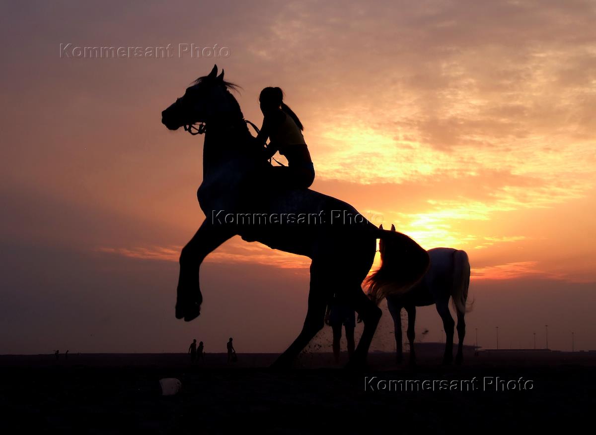 Девушки и лошади на прогулке по берегу Финского залива.