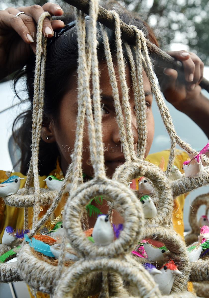 Виды Дели. Девушка продает цветы на улице пассажирам автомобилей.