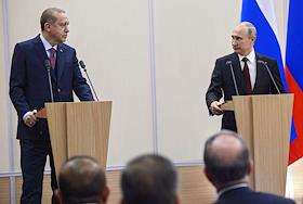 Президент России Владимир Путин (справа) и президент Турции Реджеп Тайип Эрдоган (слева) во время…