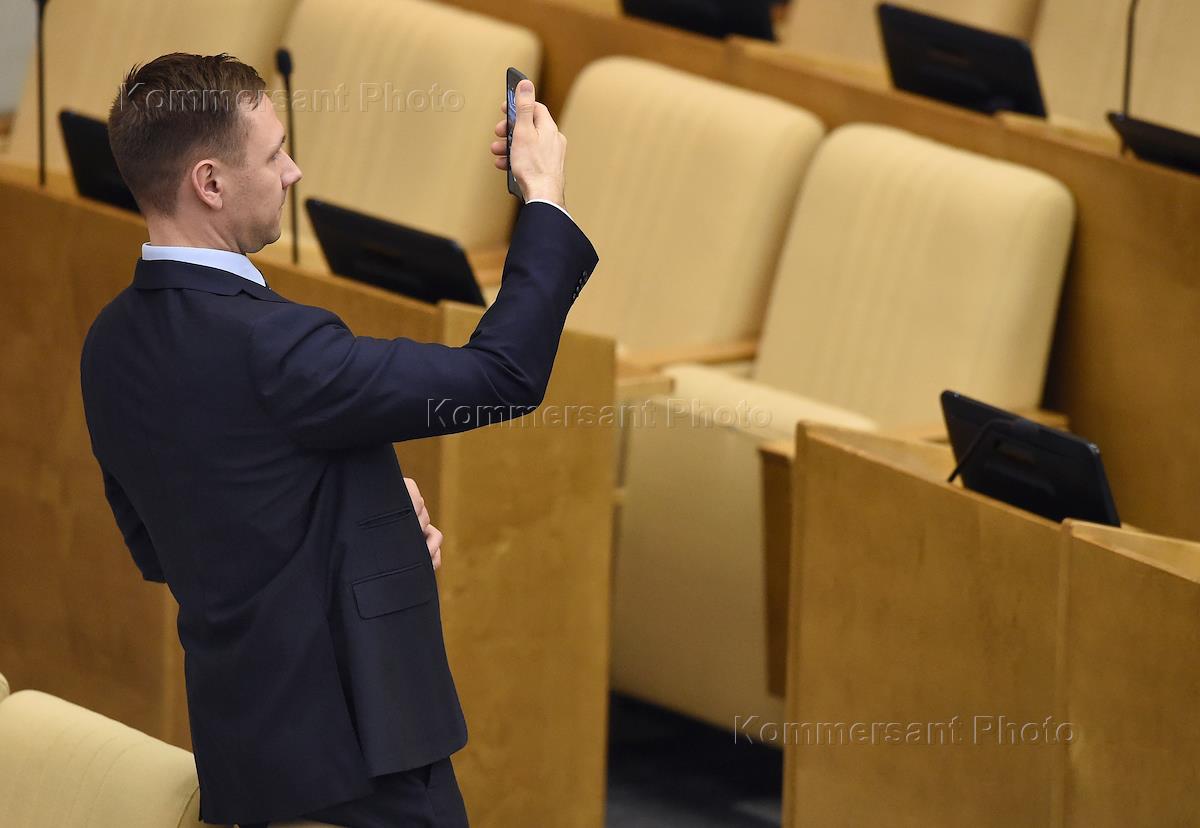 Пленарное заседание Государственной думы (ГД) России. Жанровая фотография. Депутат ГД России перед…