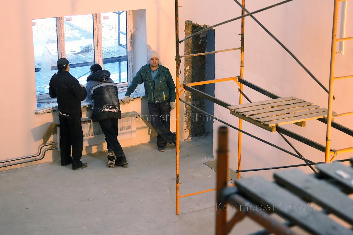 Жанровая фотография. Строительные рабочие отдыхают во время перерыва.