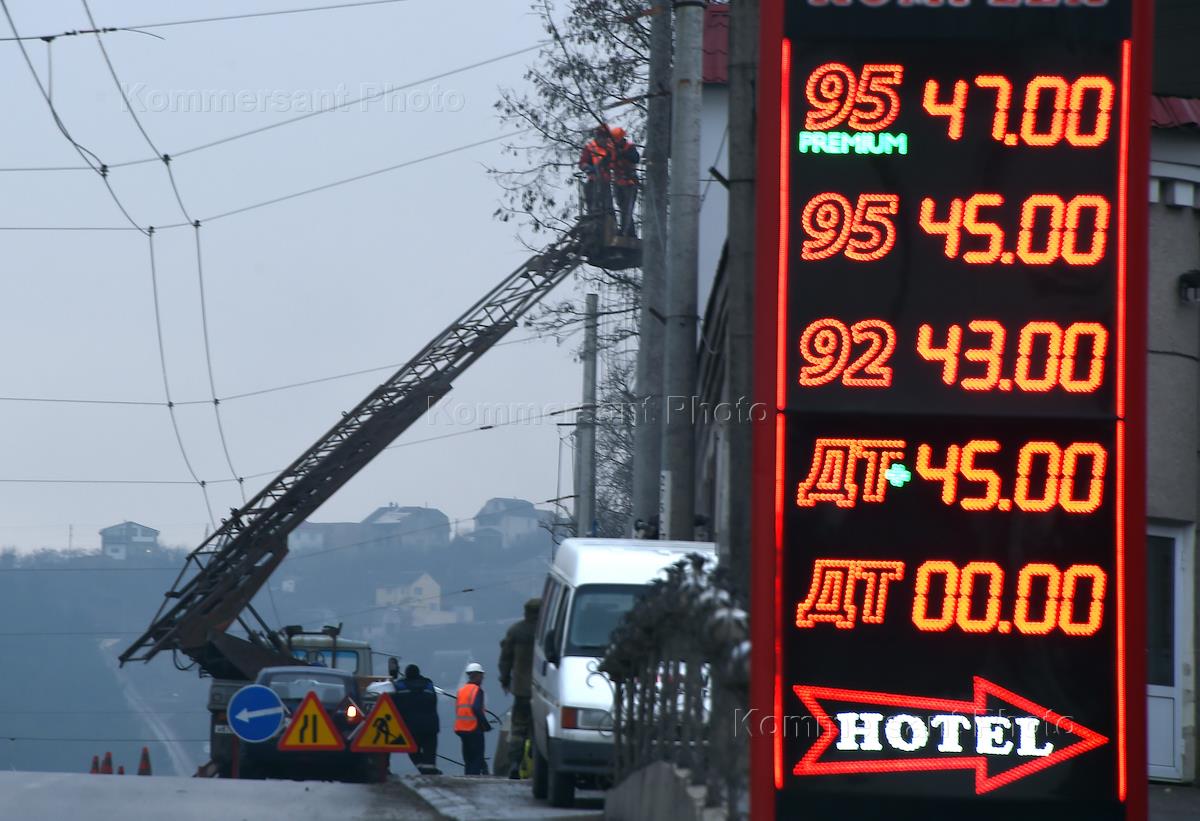 Жанровая фотография. Электронное табло с ценами топливо на автозаправочной станции (АЗС). Ремонтные…
