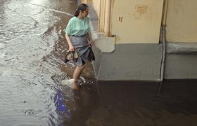 После сильного дождя в городе прохожим пришлось по колено в воде добираться до дома. Женщина идет в…