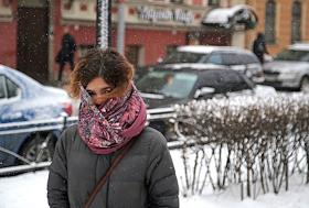Жанровая фотография. Первый снег в городе. Девушка идет под снегом по улице.