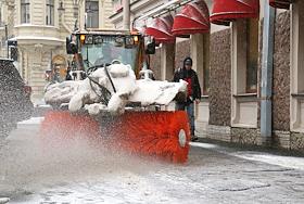 Жанровая фотография. Первый снег в городе. Снегоуборочный трактор на улице.