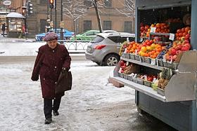 Жанровая фотография. Первый снег в городе. Торговый уличный павильон по продаже фруктов и овощей.…