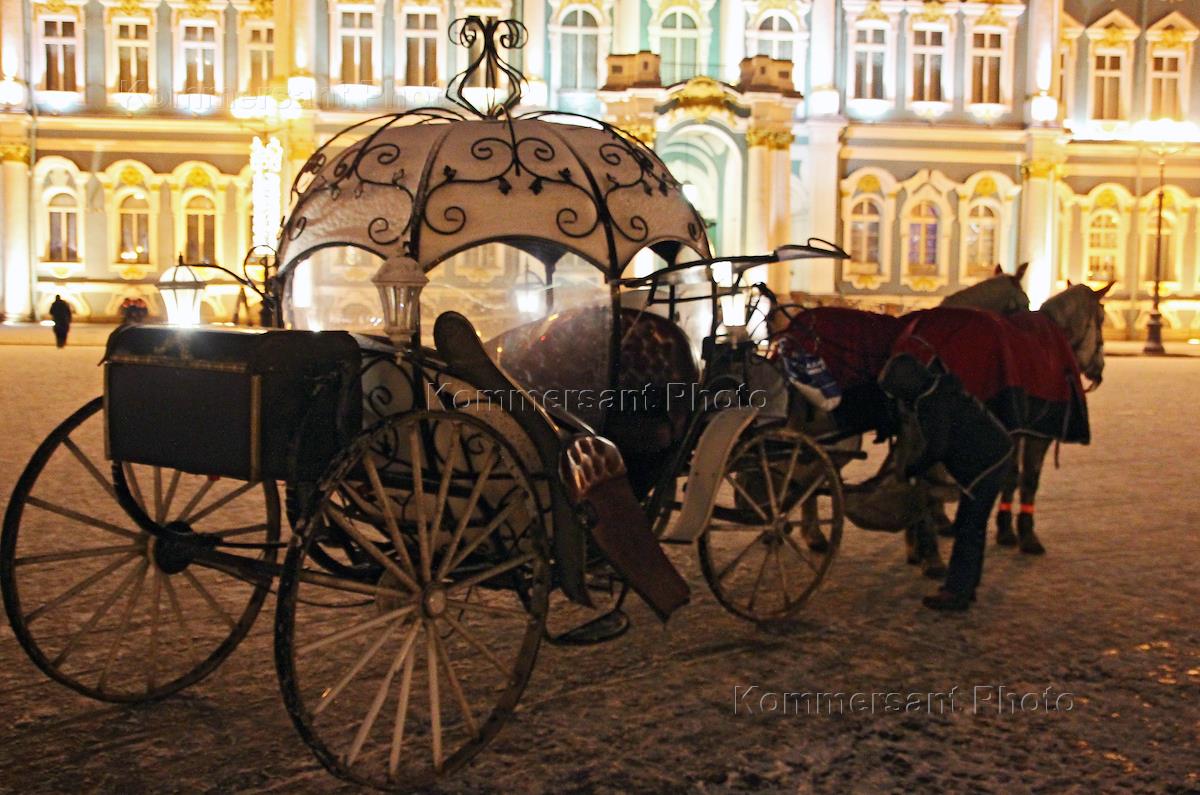 Виды Санкт-Петербурга. Дворцовая площадь вечером. Фонарь прогулочнаой кареты для туристов перед…