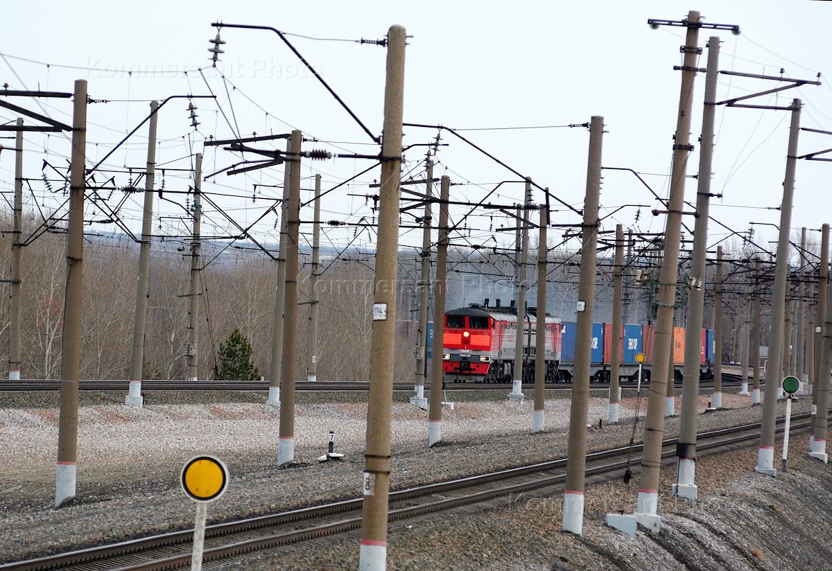 Жанровая фотография. Грузовой поезд на железнодорожных путях.