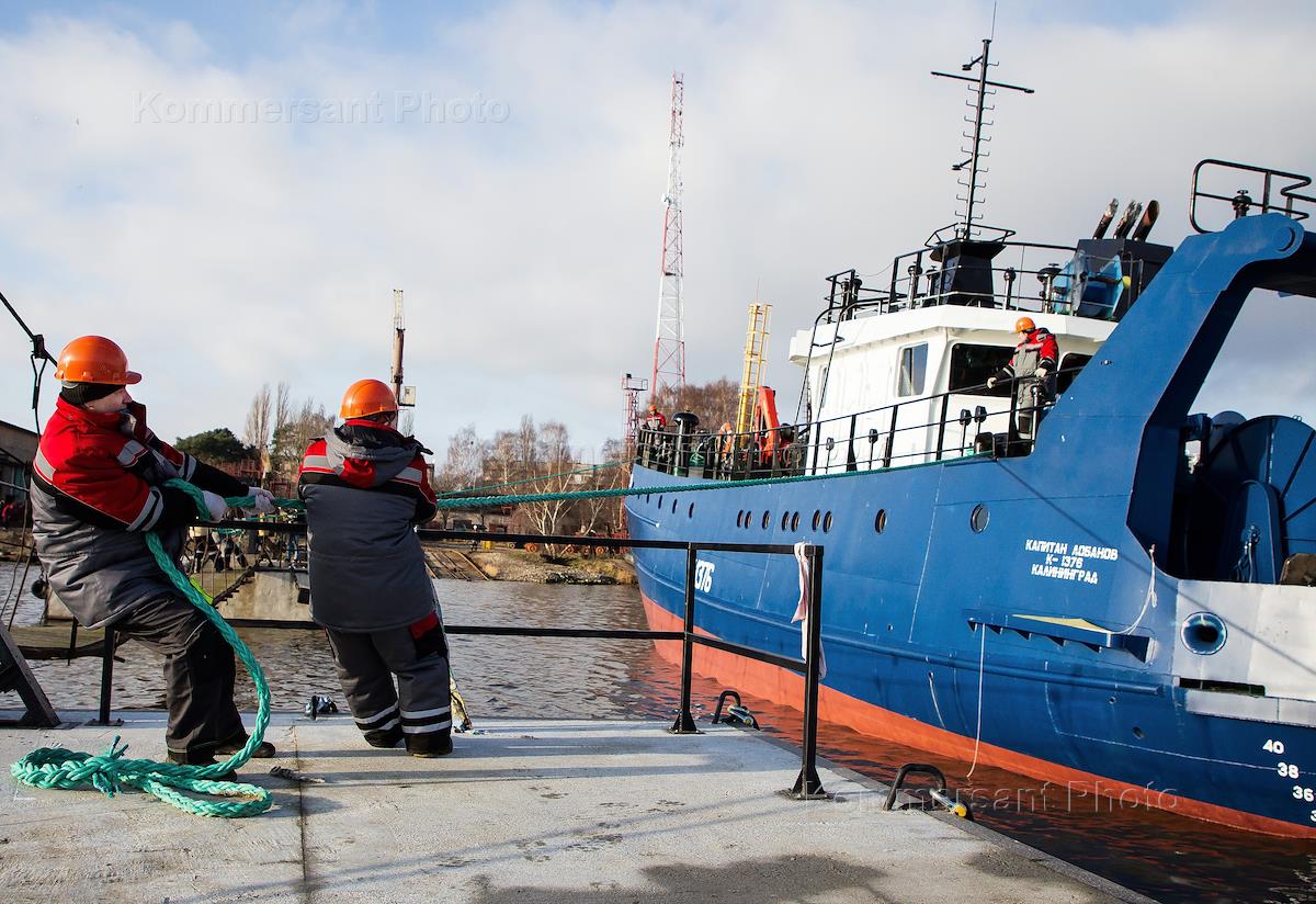 Рыболовецкое судно "Капитан Лобанов" во время церемонии спуска на воду в порту города Светлый.