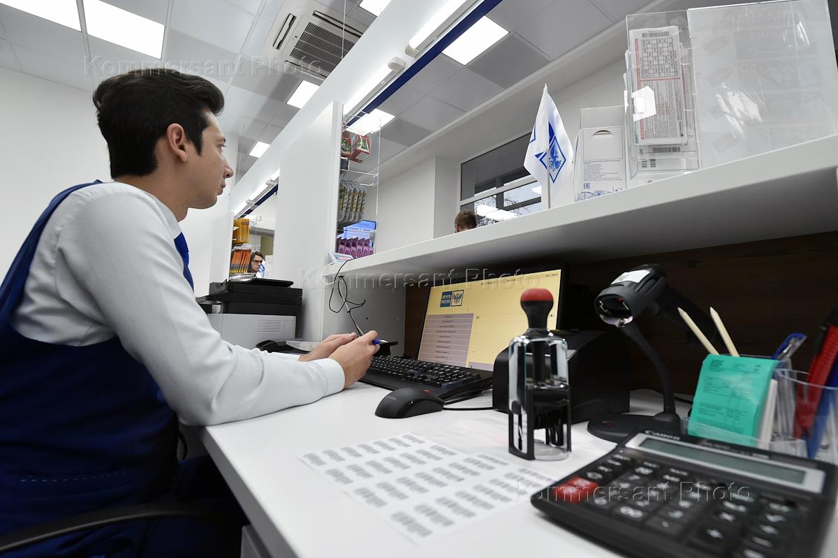 Церемония открытия почтового отделения нового формата ФГУП "Почта России". Сотрудник почты во время…