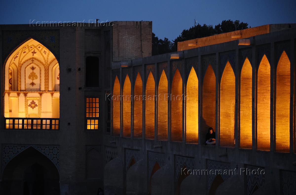 Виды города Исфахана. Мост Хаджу (арочный каменный пешеходный мост) через реку Заянде. Тегеранцы…