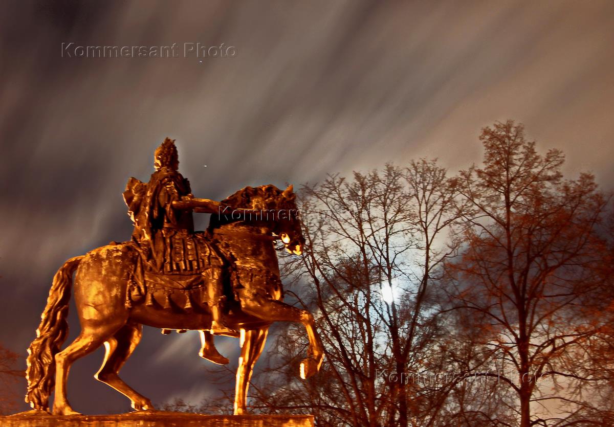Виды Санкт-Петербурга. Памятник Петру I на Кленовой аллее на фоне луны.