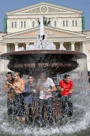 Молодые люди купаются в фонтане у Государственного академического Большого театра (ГАБТ) на…
