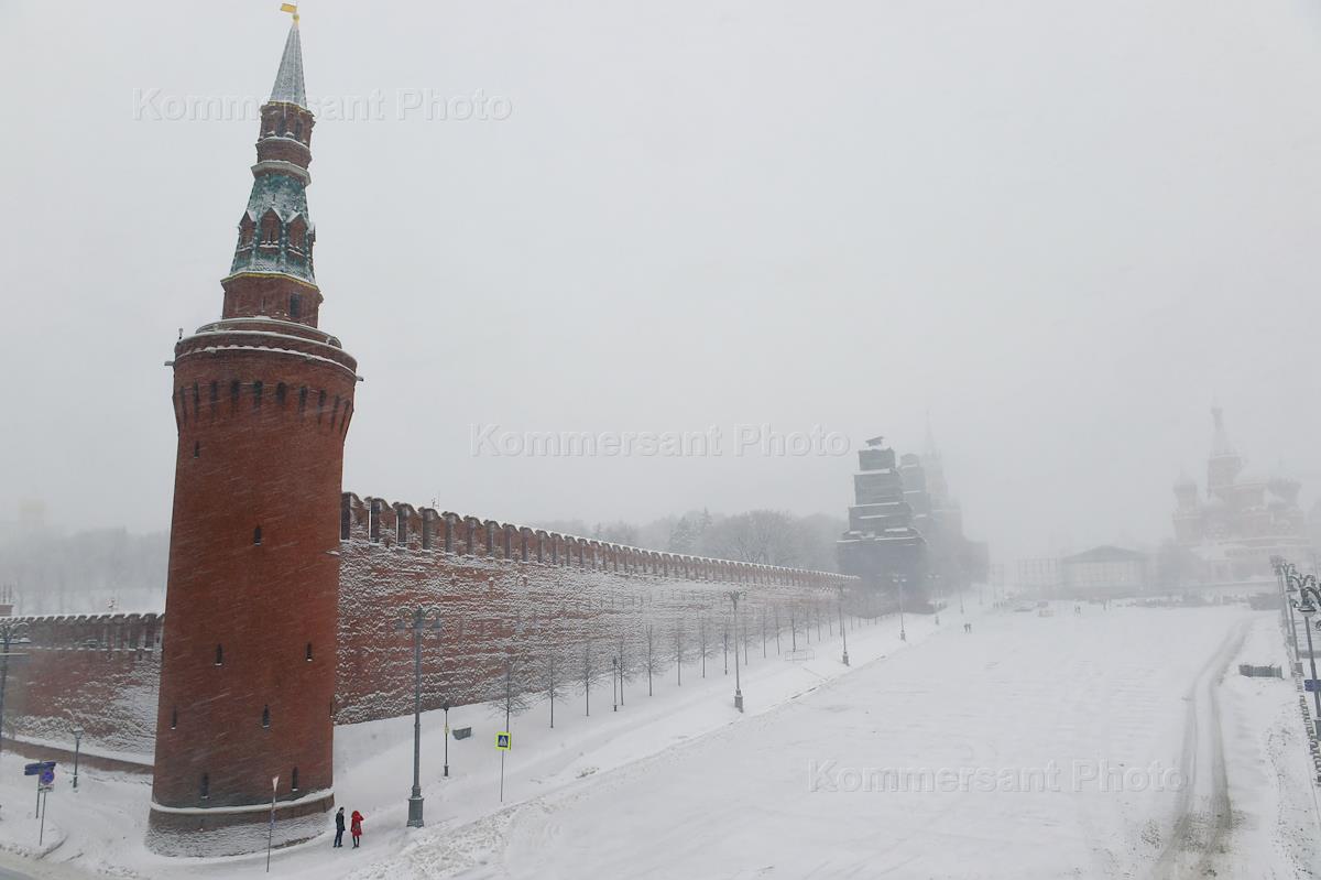 Жанровая фотография. Снегопад в Москве. Васиьевский спуск. Кремль, кремлевская стена.