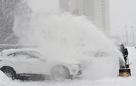 Жанровая фотография. Снегопад в Москве. Мужчина чистит снег с помощью ручной снегоуборочной машины…
