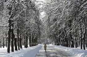 Жанровая фотография. Снегопад в Москве. Девушка на аллее парка.