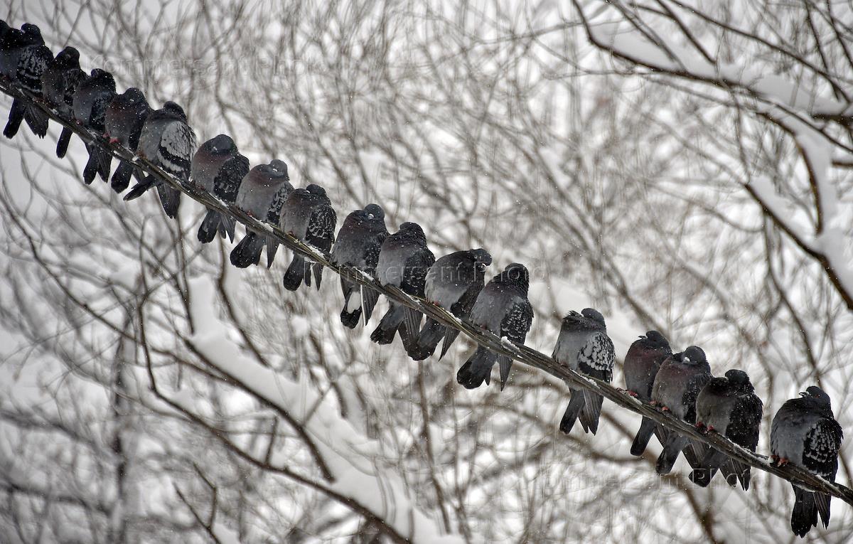 Виды Москвы во время снегопада. Голубь в кормушке в Воронцовском парке.