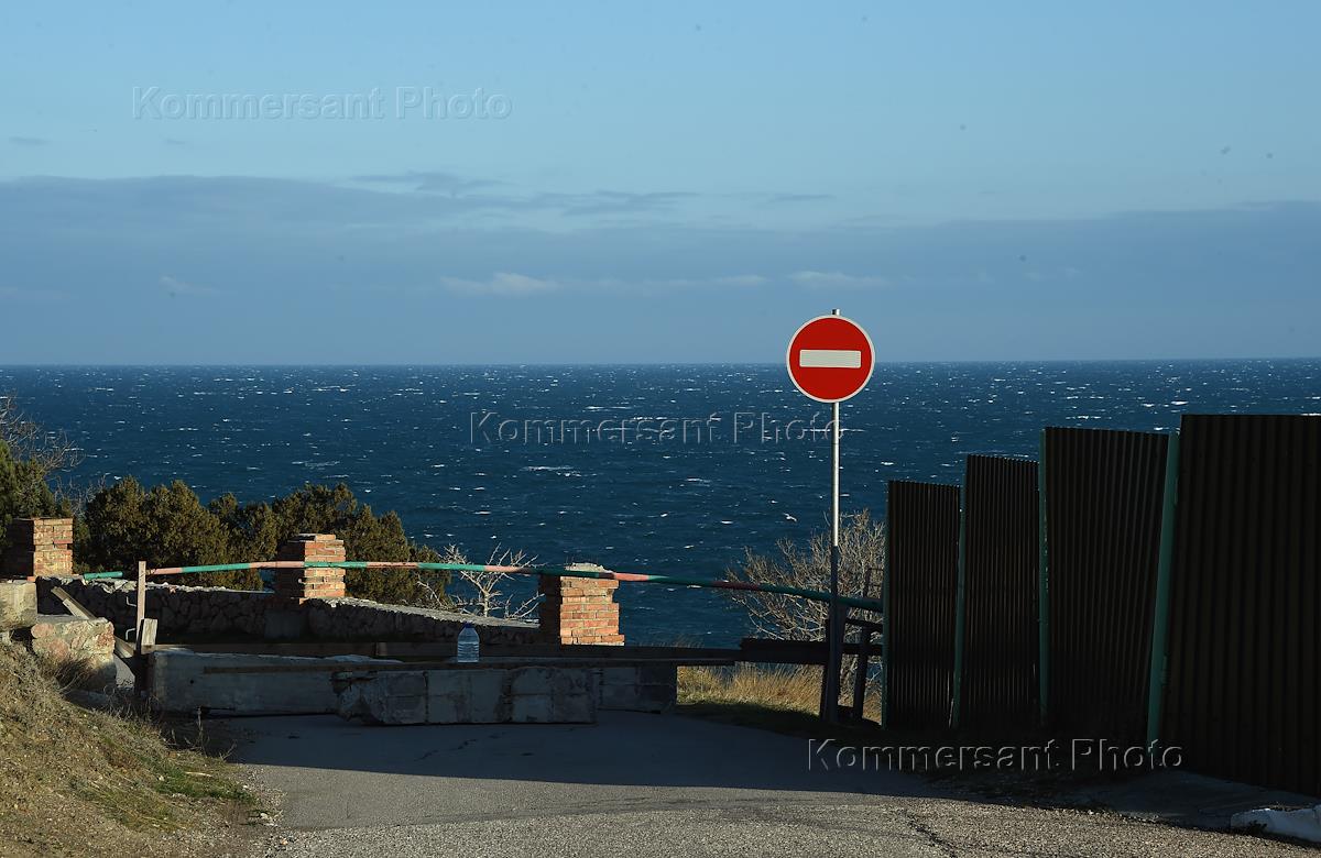 Виды Крыма. Бухта Ласпи. Забор с табличкой, запрещающей проход и проезд. Мыс Айя.