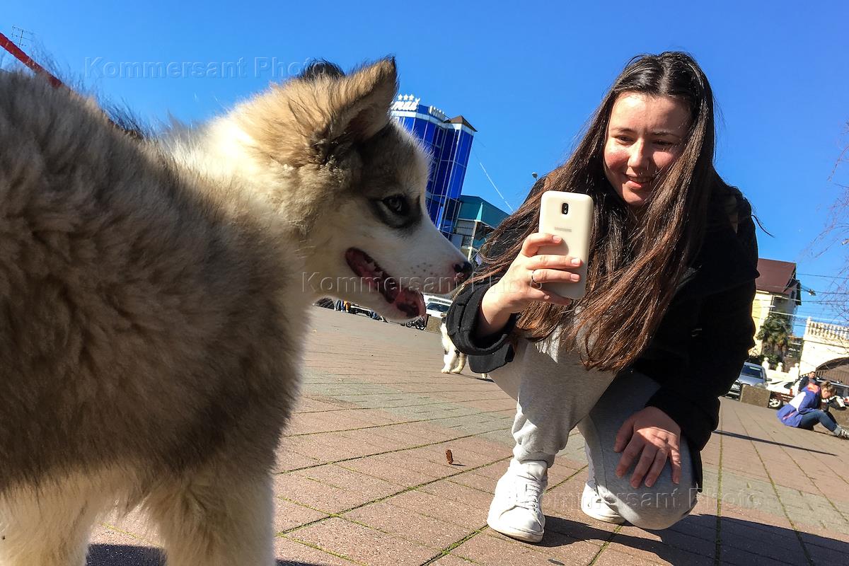 Виды Адлера - один из городских микрорайонов города Сочи. Девушка фотографирует на мобильный телефон…
