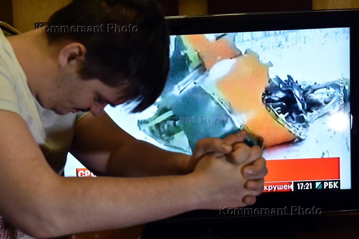 Жанровая фотография. Мужчина смотрит по телевизору о крушение самолет Ан-148 авиакомпании…