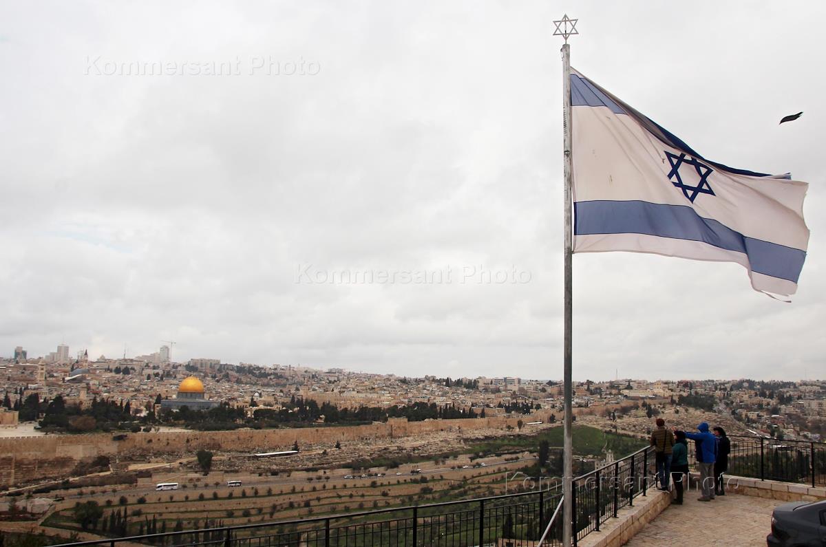 Виды Иерусалима. Государственный флаг Израиля, установленный на Масличной горе на фоне Старого…