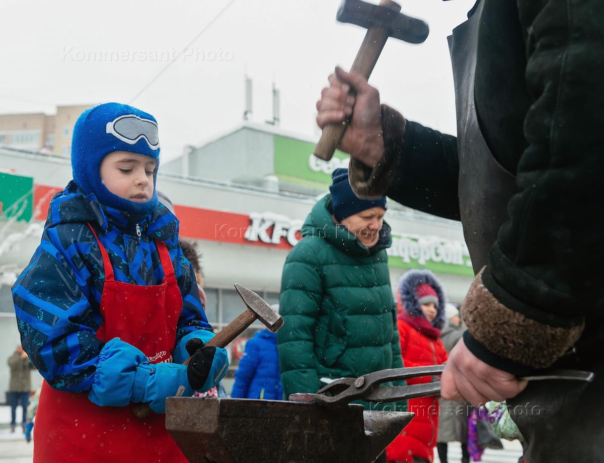 Празднование Масленицы. Кузнец обучает детей кузнечному делу во время масленичных гуляний.