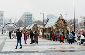 Празднование Масленицы. Павильоны, установленные для масленичных гуляний.
