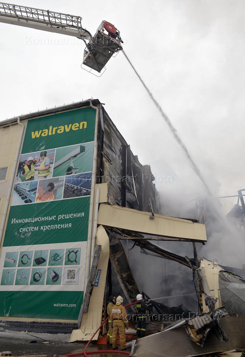 Сотрудники МЧС во время ликвидации пожара в офисном здании на Вашутинском шоссе в Химках.