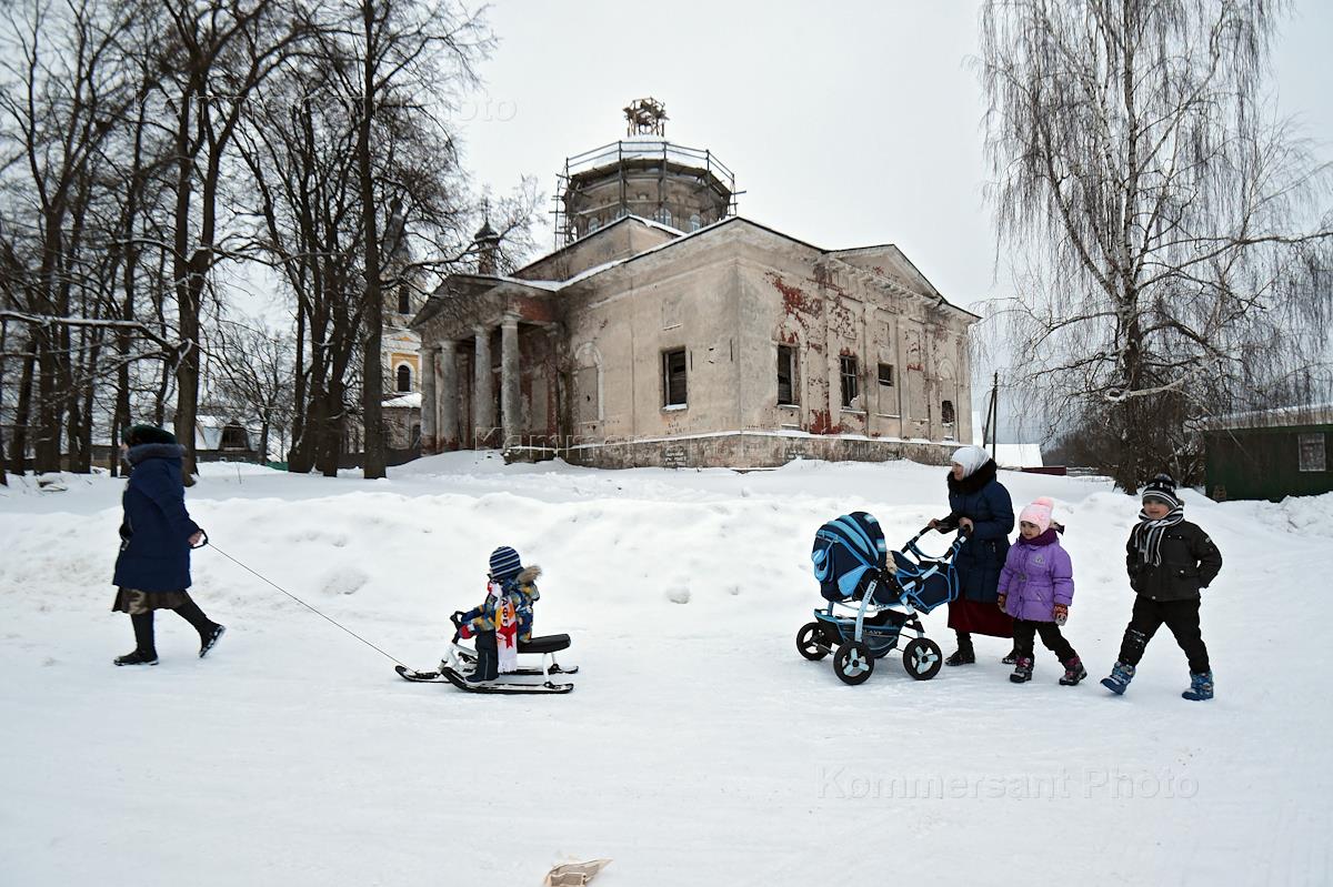 Таджикские деревни в Тверской области. Жительница села Кушалино со своими детьми на прогулке.