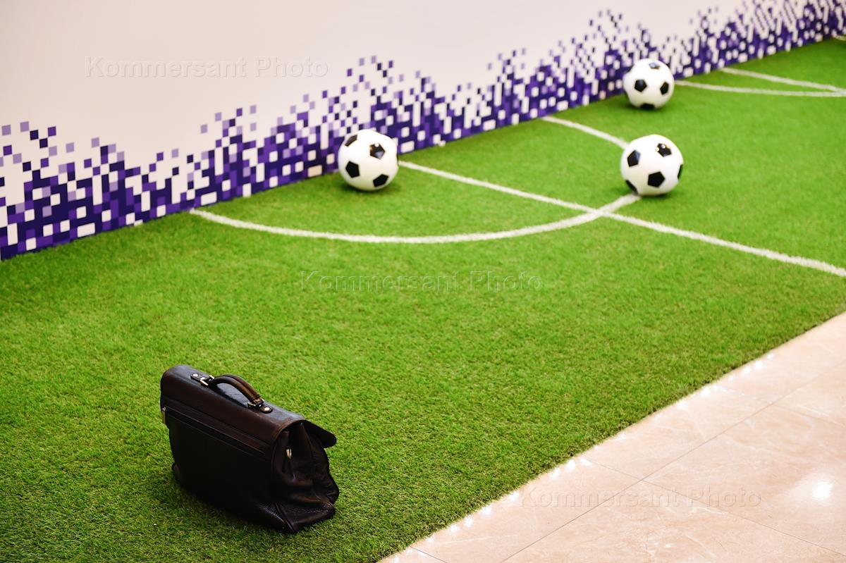 Жанровая фотография. Фрагмент футбольного поля, футбольные мячи и деловой портфель в холле здания…