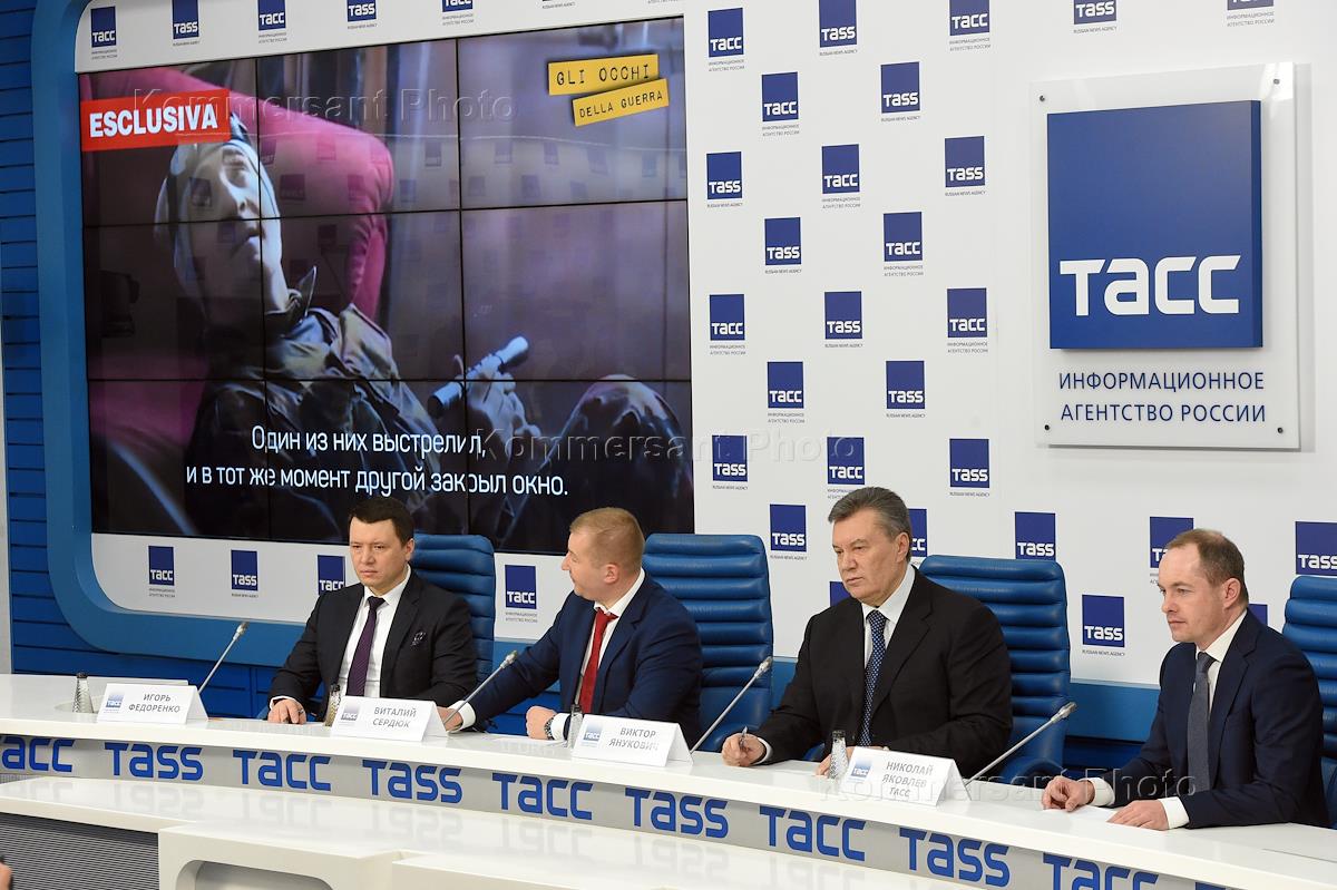 Пресс-конференция бывшего президента Украины Виктора Януковича прошла в пресс-центре ТАСС. Слева…