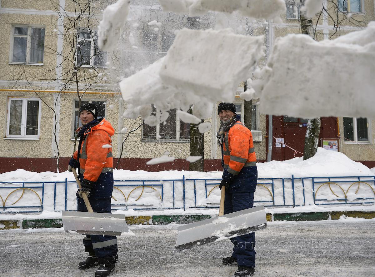Жанровая фотография. Снегопад в городе. Сотрудники коммунальных служб во время уборки снега на…