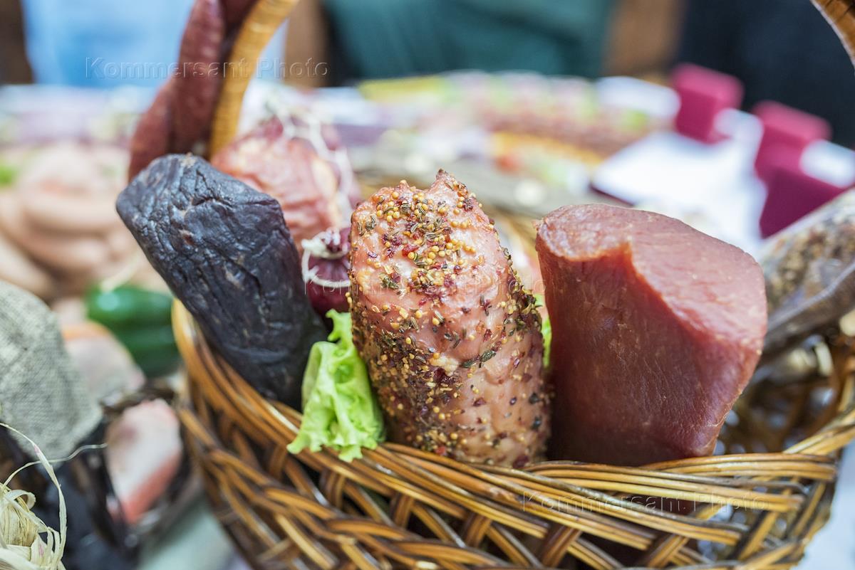 Жанровая фотография. Борисоглебский мясоконсервный комбинат. Корзинка с мясными изделиями.