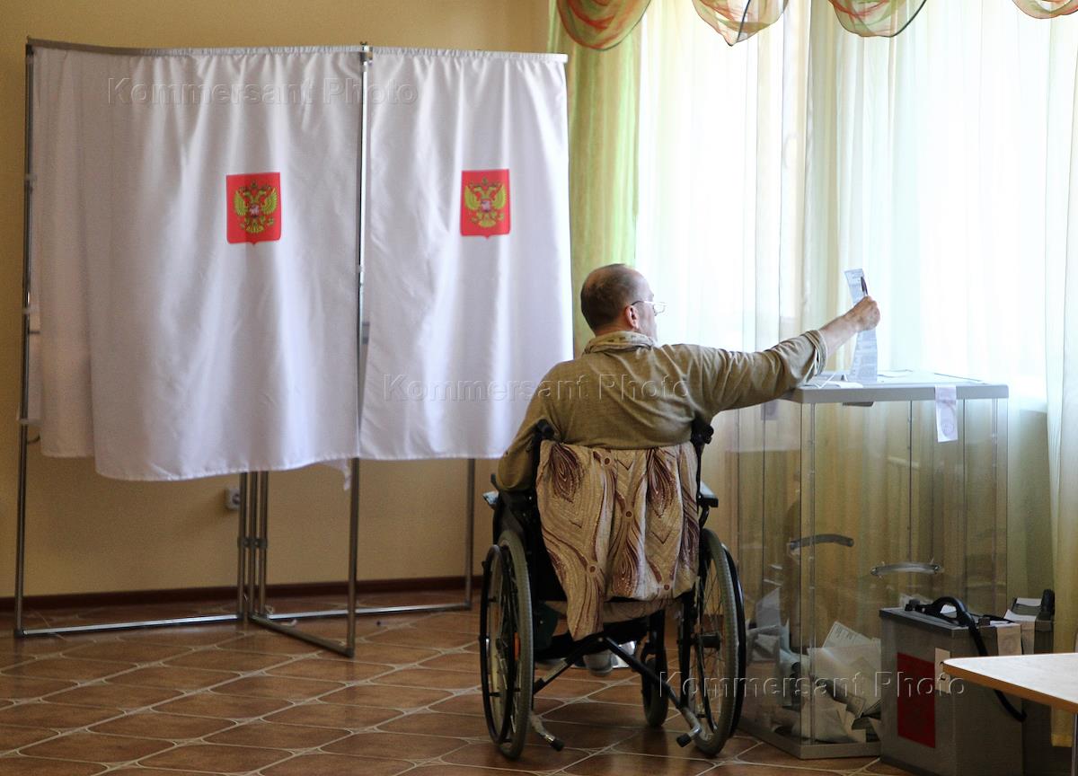Выборы президента России. Голосование на избирательном участке. Женщина на инвалидной коляске…