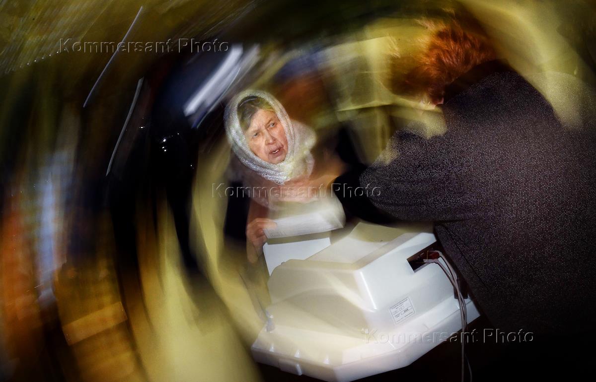 Выборы президента России. Избиратели во время голосования на избирательном участке №2579 в ГБОУ…