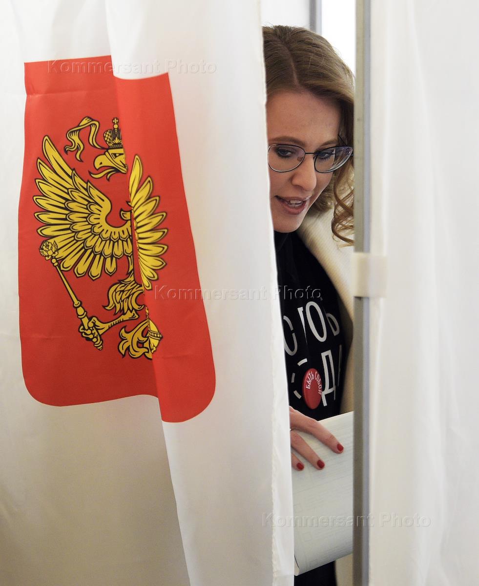 Политика Выборы президента России. Кандидат на пост президента России от партии "Гражданская инициатива" Ксения Собчак во время голосования на избирательном участке № 158 в ДМШ им. Л. Бетховена.