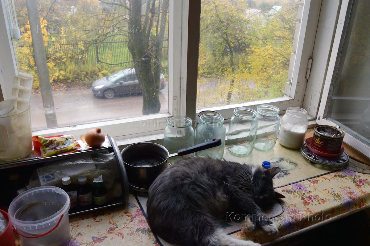 Жанровая фотография. Кошка лежит на подоконнике на кухне.
