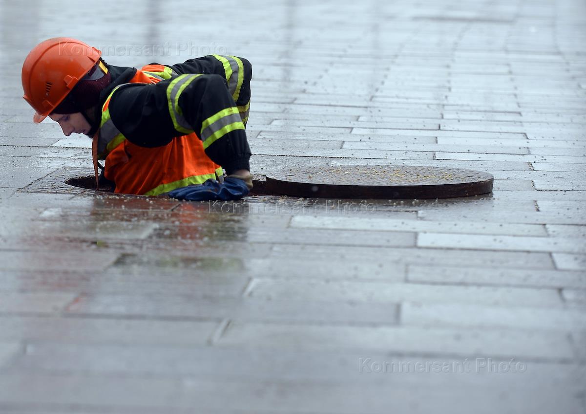 Жанровая фотография. Сотрудник коммунальных служб города вылезает из люка на тротуаре.