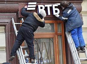 Жанровая фотография. Мужчины устанавливают на фасаде здания логотип банка ВТБ.