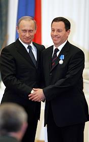 Президент России Владимир Путин (слева) поздравляет председателя правления некоммерческой…
