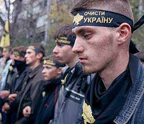 Выборы президента Украины. Молодежь Украины с черными повязками на лбу "Очисти Украину!".