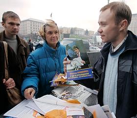 Выборы президента Украины. Молодой человек раздает листовки кандидата на пост президента Украины…