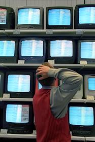 Жанровая фотография. Продавец у прилавка с телевизорами в магазине "Мир".