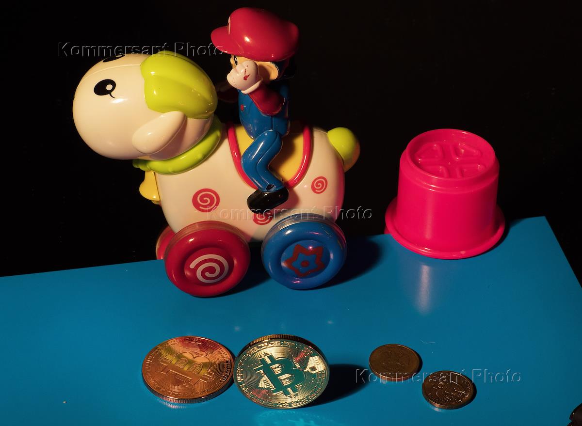 Жанровая фотография. Криптовалюта биткоин (Bitcoin). Монеты биткоин и детские игрушки.
