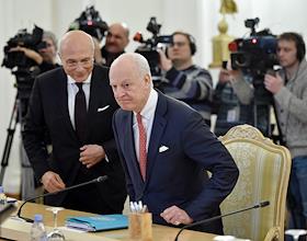Специальный представитель генерального секретаря ООН по Сирии Стаффан де Мистура (в центре), министр…