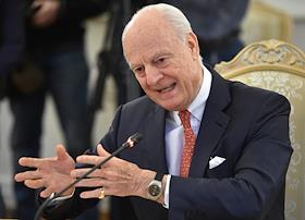 Специальный представитель генерального секретаря ООН по Сирии Стаффан де Мистура во время встречи с…