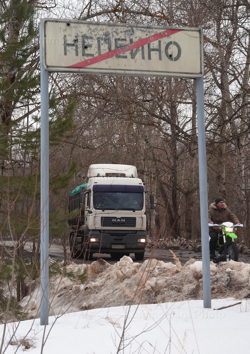 Полигон твердых бытовых отходов в Непейно. Мусоровоз на въезде в деревню.